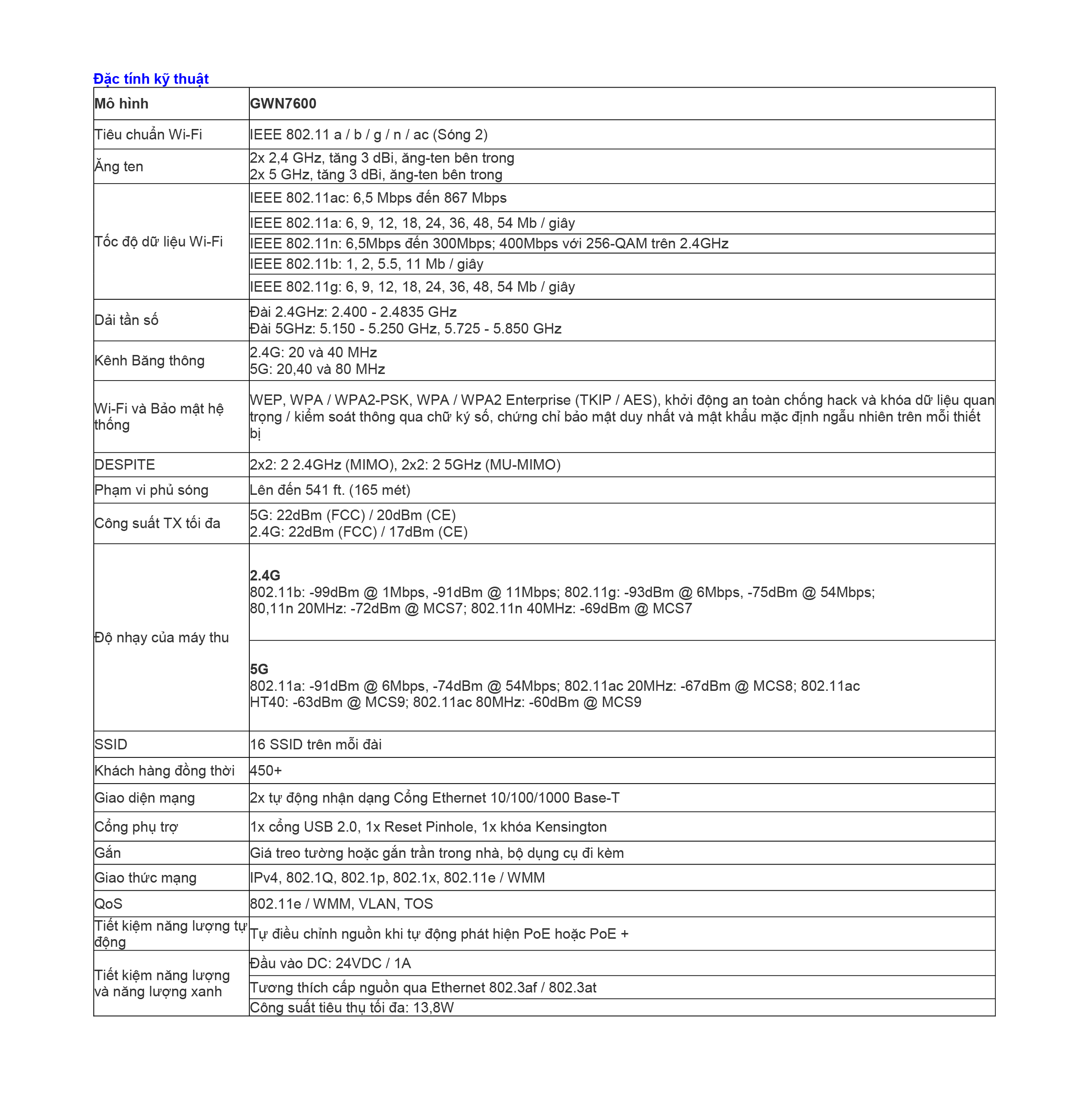 – 16 SSID, 450 client đồng thời, Cự ly 165 mét